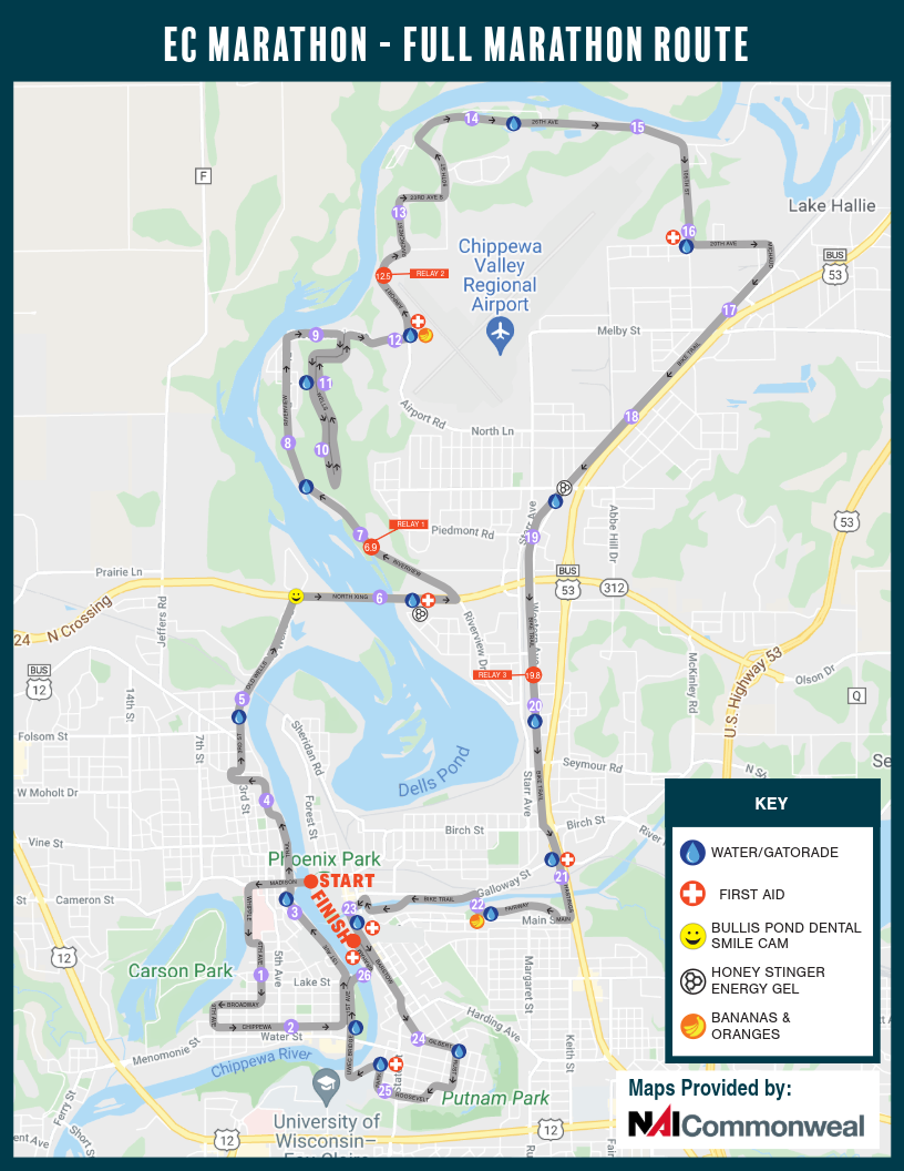 Energy gel and chews will be handed out at two locations along the courses (near Mile 6 and Mile 18.5). Scheels of Eau Claire is donating and handing out Honey Stinger Gels and Honey Stinger Chews.