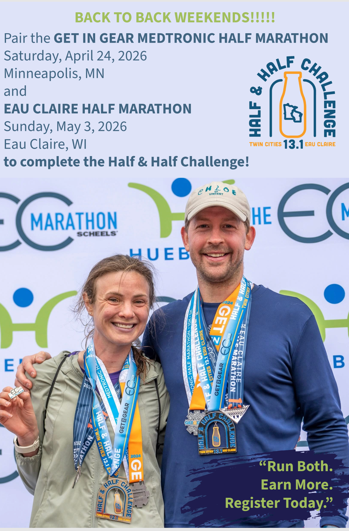The Eau Claire Marathon is excited to partner with the Get in Gear Half Marathon for the HALF & HALF CHALLENGE.